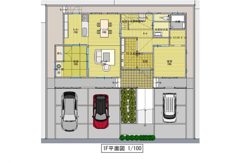 リビングと和室が繋がっていて、キッチンから和室が見える造りを希望。和室には丸窓が欲しい。外観は京都にあるような和モダンのお洒落なカフェのような雰囲気にしたい。息子も運転するので駐車場は3台。