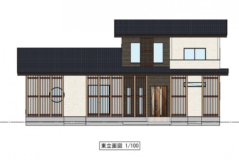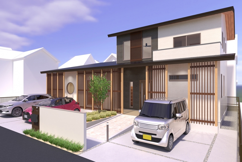 - 木目調のルーバーを主役に、軒天も木目調に揃えて「和」を感じるデザインに