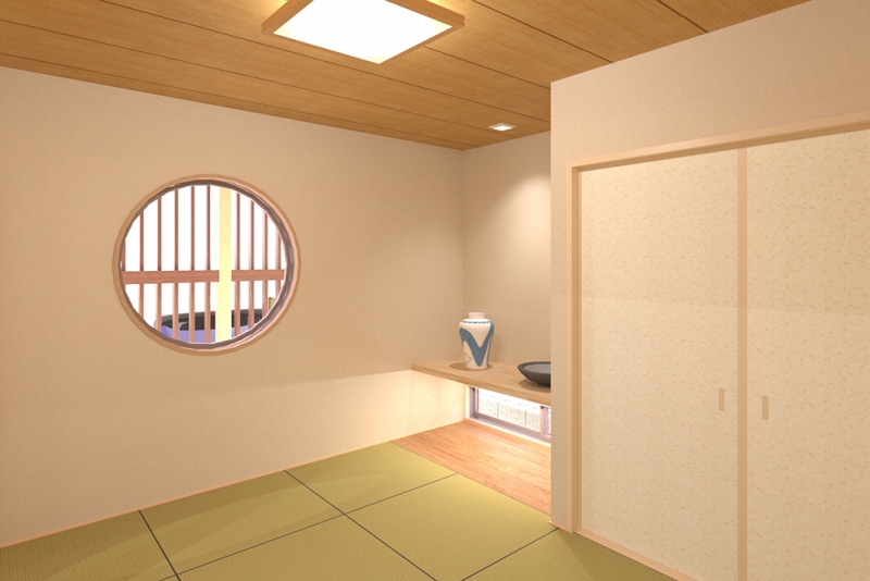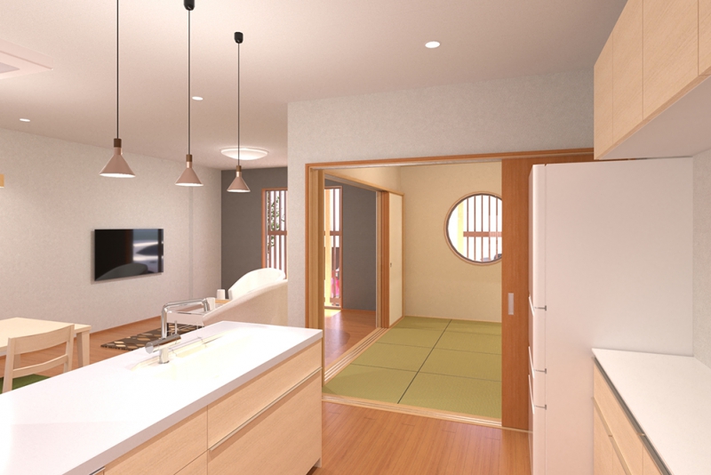 - 『キッチンから見える、リビングと繋がった丸窓の和室』に一工夫