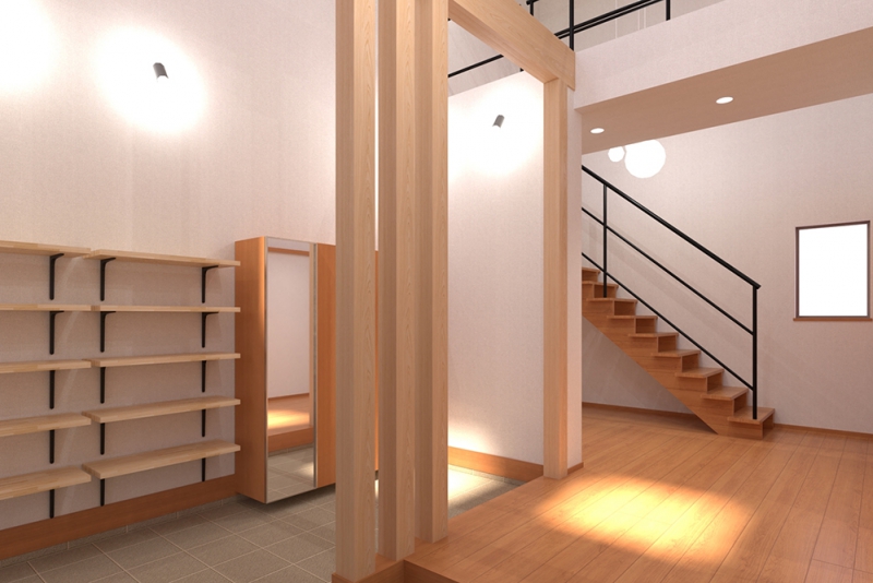- 玄関には広々としたクロークを併設。建具、壁を無くし、「和」をイメージした木材の化粧梁と化粧柱で区切ることで、開放的な空間に