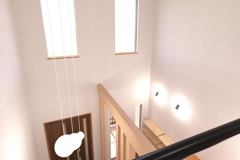 - 玄関とクロークの上部は吹抜けで計画。上部の大きな窓から光を取り込み、明るさを確保